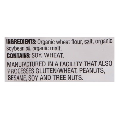 INGREDIENTS: Organic Wheat Flour, Salt, Organic Soybean Oil, Organic Malt.
