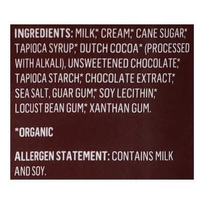 INGREDIENTS: Milk (Organic), Cream (Organic), Cane Sugar (Organic), Tapioca Syrup (Organic), Dutch Cocoa (Organic) (Processed with Alkali), Unsweetened Chocolate (Organic), Tapioca Starch (Organic), Chocolate Extract (Organic), Sea Salt, Guar Gum (Organic), Soy Lecithin (Organic), Locust Bean Gum (Organic), Xanthan Gum.