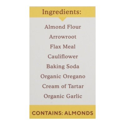 INGREDIENTS: Almond Flour, Arrowroot, Flax Meal, Cauliflower, Baking Soda, Organic Oregano, Cream of Tartar, Organic Garlic.