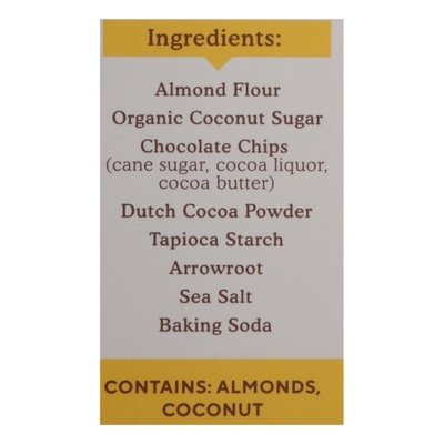 INGREDIENTS: Almond Flour, Organic Coconut Sugar, Chocolate Chips (Cane Sugar, Cocoa Liquor, Cocoa Butter), Dutch Cocoa Powder, Tapioca Starch, Arrowroot, Sea Salt, Baking Soda.
