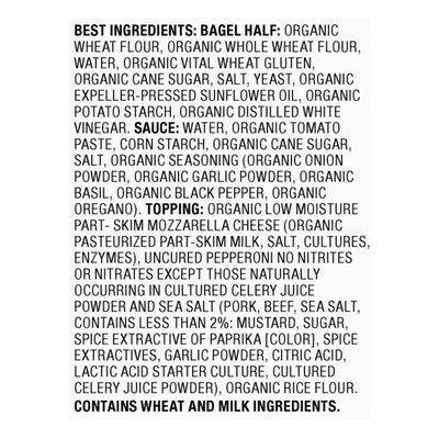 INGREDIENTS: Bagel Half: Organic Wheat Flour, Organic Whole Wheat Flour, Water, Organic Vital Wheat Gluten, Organic Cane Sugar, Salt, Yeast, Organic Expeller-Pressed Sunflower Oil, Organic Potato Starch, Organic Distilled White Vinegar, Sauce: Water, Organic Tomato Paste, Corn Starch, Organic Cane Sugar, Salt, Organic Seasoning (Organic Onion Powder, Organic Garlic Powder, Organic Basil, Organic Black Pepper, Organic Oregano), Topping: Organic Low Moisture Part- Skim Mozzarella Cheese (Organic Pasteurized Part-Skim Milk, Salt, Cultures, Enzymes), Uncured Pepperoni No Nitrites or Nitrates Except Those Naturally Occurring in Cultured Celery Juice Powder and Sea Salt (Pork, Beef, Sea Salt, Contains Less than 2%: Mustard, Sugar, Spice Extractive of Paprika [Color], Spice Extractives,Garlic Powder, Citric Acid, Lactic Acid Starter Culture, Cultured Celery Juice Powder), Organic Rice Flour.