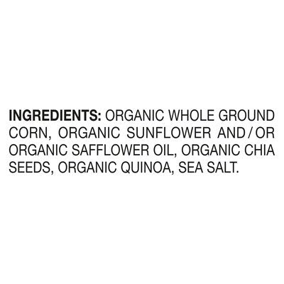 INGREDIENTS: Organic Whole Ground Corn, Organic Sunflower and/or Organic Safflower Oil, Organic Chia Seeds, Organic Quinoa, Sea Salt.