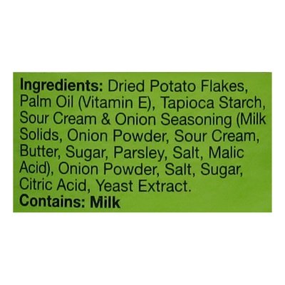 INGREDIENTS: Dried Potato Flakes, RSPO Sustainable Palm Oil (Vitamin E), Tapioca Starch, Sour Cream & Onion Flavor (Milk Solids, Onion Powder, Sour Cream, Butter, Sugar, Parsley, Salt, Malic Acid, Silicon Dioxide as an Anticaking Agent) Onion Powder, Salt, Sugar, Citric Acid, Yeast Extract.