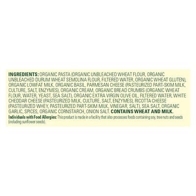 INGREDIENTS:  Organic Pasta (Organic Unbleached Wheat Flour, Organic Unbleached Durum Wheat Semolina Flour, Filtered Water, Organic Wheat Gluten), Organic Lowfat Milk, Organic Basil, Parmesan Cheese (Pasteurized Part-Skim Milk, Culture, Salt, Enzymes), Organic Cream, Organic Bread Crumbs (Organic Wheat Flour, Water, Yeast, Sea Salt), Organic Extra Virgin Olive Oil, Filtered Water, White Cheddar Cheese (Pasteurized Milk, Culture, Salt, Enzymes), Ricotta Cheese (Pasteurized Whey, Pasteurized Part-Skim Milk, Vinegar, Salt), Sea Salt, Organic Garlic, Spices, Organic Cornstarch, Onion Salt.