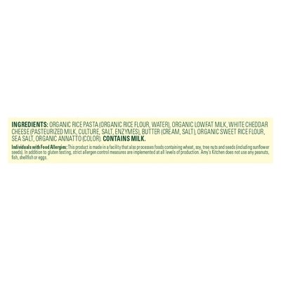 PRODUCT DETAILS: Certified Organic. Certified Organic by Quality Assurance International (QAI). Gluten Free. If it's organic it's non GMO. Microwave or regular oven. Amy loves our Mac & Cheese, but some of her friends, like many Amy's customers, are not able to eat it because they are gluten intolerant. So we decided to create a dish that does not include any wheat, and searched until we found a macaroni-style pasta made from organic rice. Then we covered the tender rice pasta with the same smooth cheese sauce that has made our Mac & Cheese so popular, and came up with this great-tasting dish for all our customers to eat and enjoy. From our home to yours. Family owned since 1987. After the birth of our daughter Amy in 1987, we found there was little time to prepare the quality homemade food we normally ate. Realizing there were others like ourselves, we started Amy's Kitchen to prepare delicious meals for those who care about the food they eat but are often too busy to cook. We use only the finest ingredients and prepare them with the same careful attention in our kitchen as you would in your own home. No meat, fish, shellfish, poultry, eggs or peanuts are ever used in any Amy's products. amys.com. how2recycle.info. We love to cook for you amys.com. Look for us in the soup aisle! Certified 100% recycled paperboard.