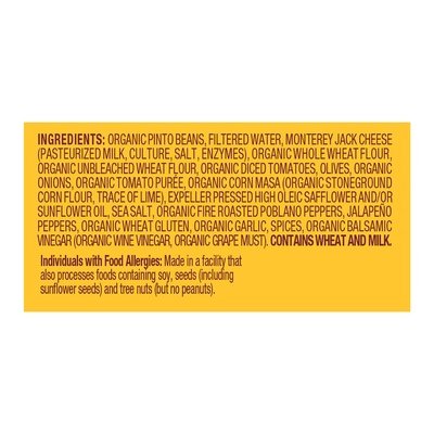 INGREDIENTS: Organic Pinto Beans, Filtered Water, Monterey Jack Cheese (Pasteurized Milk, Culture, Salt, Enzymes), Organic Whole Wheat Flour, Organic Unbleached Wheat Flour, Organic Diced Tomatoes, Olives, Organic Onions, Organic Tomato Puree, Organic Corn Masa (Organic Stoneground Corn Flour, Trace of Lime), Expeller Pressed High Oleic Safflower and/or Sunflower Oil, Sea Salt, Organic Fire Roasted Poblano Peppers, Jalapeno Peppers, Organic Wheat Gluten, Organic Garlic, Spices, Organic Balsamic Vinegar (Organic Wine Vinegar, Organic Grape Must).