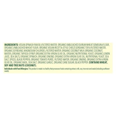 INGREDIENTS: Vegan Spinach Ravioli (Filtered Water, Organic Unbleached Durum Wheat Semolina Flour, Organic Unbleached Wheat Flour, Organic Vegan Ricotta-Style Cheeze [Organic Tofu (Filtered Water, Organic Soybeans, Magnesium Chloride), Filtered Water, Organic Coconut Milk (Organic Coconut, Water), Organic Tapioca Syrup, Organic Extra Virgin Olive Oil, Organic Nutritional Yeast, Organic Lemon Juice, Sea Salt], Organic Spinach, Organic Onions, Organic Extra Virgin Olive Oil, Nutritional Yeast, Sea Salt, Spices, Black Pepper), Organic Tomato Purée, Filtered Water, Organic Onions, Organic Extra Virgin Olive Oil, Organic Basil, Sea Salt, Organic Garlic, Organic Cane Sugar, Black Pepper.