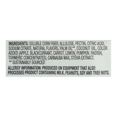 INGREDIENTS: Soluble Corn Fiber (Non-GMO), Allulose (Non-GMO), Pectin, Citric Acid, Sodium Citrate, Natural Flavors, Palm Oil (Sustainably Sourced), Coconut Oil, Color Added (Apple, Blackcurrant, Carrot, Lemon, Pumpkin, Radish, Saffron Concentrates), Carnauba Wax, Stevia Extract.