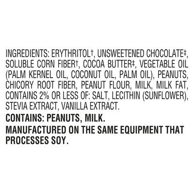 INGREDIENTS: Chocolate (Unsweetened Cocoa, Cocoa Butter, Erythritol (Non-GMO), Chicory Root Fiber, Dextrin (Non-GMO), Whole Milk Powder (Rbst Free), Milk Fat (Rbst Free), Sunflower Lecithin, Stevia Extract, Vanilla Extract), Peanut Butter (Peanuts, Palm Kernel Oil (Sustainably Sourced), Erythritol (Non-GMO), Peanut Flour, Chicory Root Fiber, Coconut Oil, Palm Oil (Sustainably Sourced), Salt, Sunflower Lecithin, Stevia Extract).