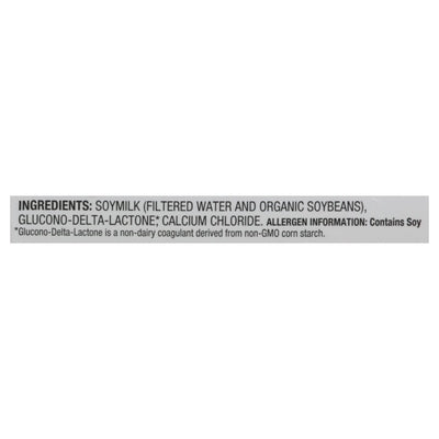 INGREDIENTS: Soymilk (Filtered Water and Organic Soybeans), Glucono-Delta-Lactone (Glucono-Delta-Lactone is a Non-Dairy Coagulant Derived from Non-GMO Corn Starch), Calcium Chloride.