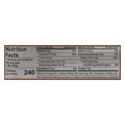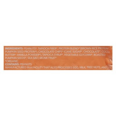 INGREDIENTS: Peanuts (Organic), Tapioca Fiber (Organic), Protein Blend (Organic) (Brown Rice Protein (Organic) Pumpkin Seed Protein (Organic)), Chocolate Chips (Organic) (Cane Sugar (Organic), Chocolate (Organic), Cocoa Butter (Organic), Vanilla Powder (Organic)), Tapioca Syrup (Organic), Vegetable Glycerin (Organic), Roasted Pumpkin Seeds (Organic), Sea Salt, Monk Fruit (Organic).