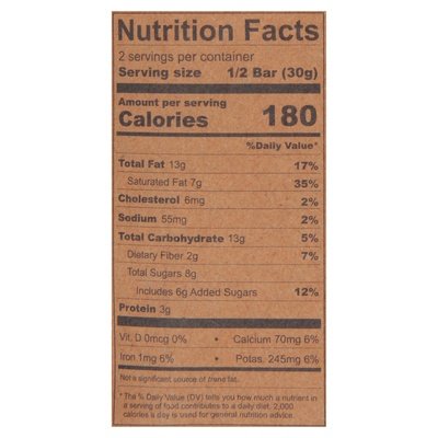 INGREDIENTS: Organic Cacao (Certified Fairtrade Ingredients), Organic Unrefined Coconut Sugar, Organic Grass-Fed Milk, Organic Cocoa Butter (Certified Fairtrade Ingredients), Organic Almonds, Organic Coconut Flakes, Organic Hazelnut Butter, Sea Salt.