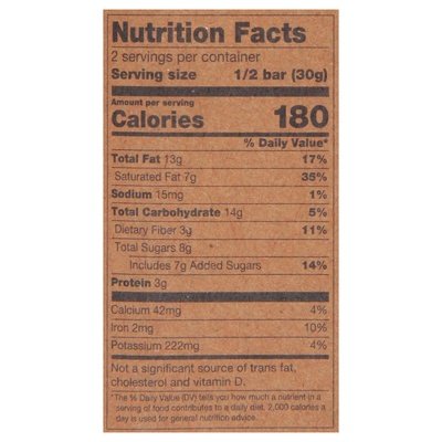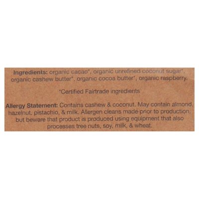 INGREDIENTS: Organic Cacao (Certified Fairtrade Ingredients), Organic Unrefined Coconut Sugar (Certified Fairtrade Ingredients), Organic Cashew Butter (Certified Fairtrade Ingredients), Organic Cocoa Butter (Certified Fairtrade Ingredients), Organic Raspberry.