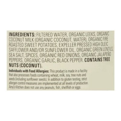 INGREDIENTS: Filtered Water Organic Leeks, Organic Coconut Milk (Organic Coconut, Water), Organic Fire Roasted Sweet Potatoes Expeller Pressed High Oleic Safflower and/or Sunflower Oil Organic Green Lentils, Sea Salt, Spices, Organic Red Onions, Organic Jalapeno Peppers, Organic Garlic, Black Pepper.