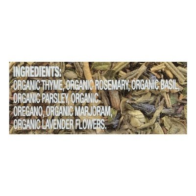 INGREDIENTS: Organic Thyme, Organic Rosemary, Organic Basil, Organic Parsley, Organic Oregano, Organic Marjoram, Organic Lavender Flowers.